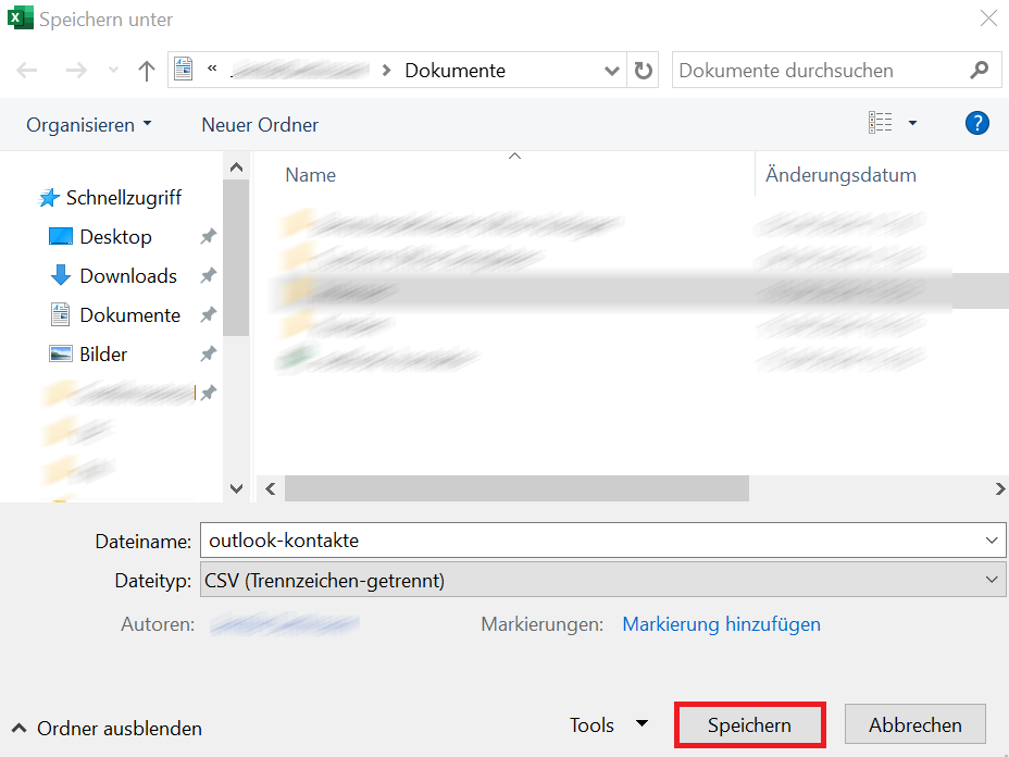 - Wähle den Eintrag „CSV (Trennzeichen-getrennt)“ aus und klicke auf „Speichern“. Bestätige den Hinweis zu möglichen Formatverlusten einfach mit „OK“.