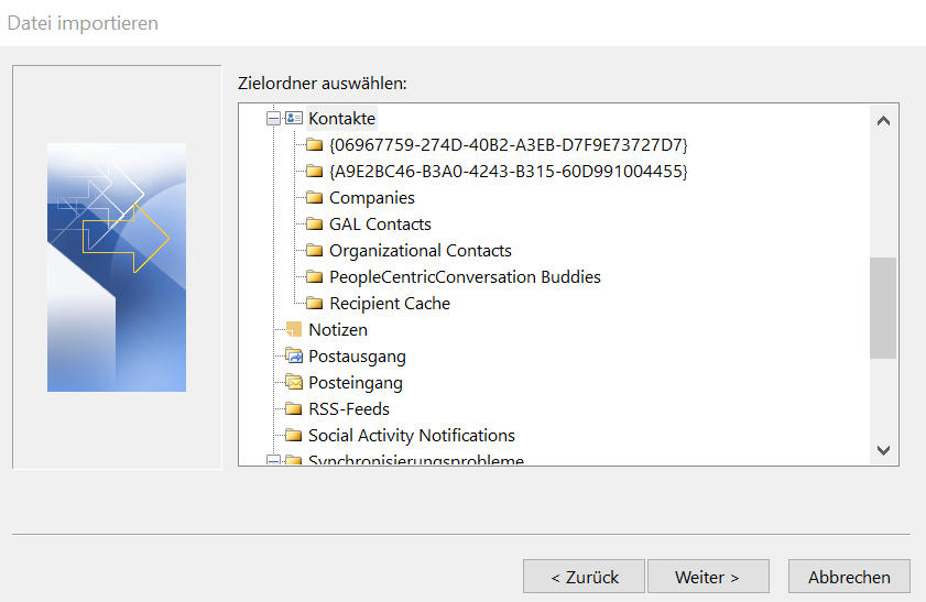 - Zielordner „Kontakte“ selektieren -> „Weiter“ -> „Fertig stellen“