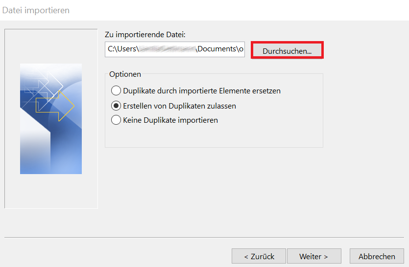 Wähle vor dem Klick auf „Weiter“ eine dieser Optionen für den Umgang mit Duplikaten: