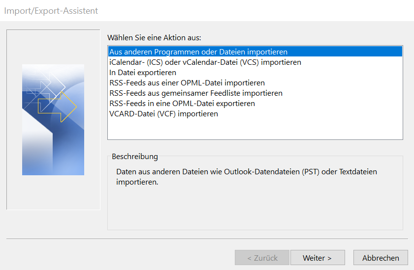 - Im Assistenten „Aus anderen Programmen oder Dateien importieren“ wählen -> „Weiter“