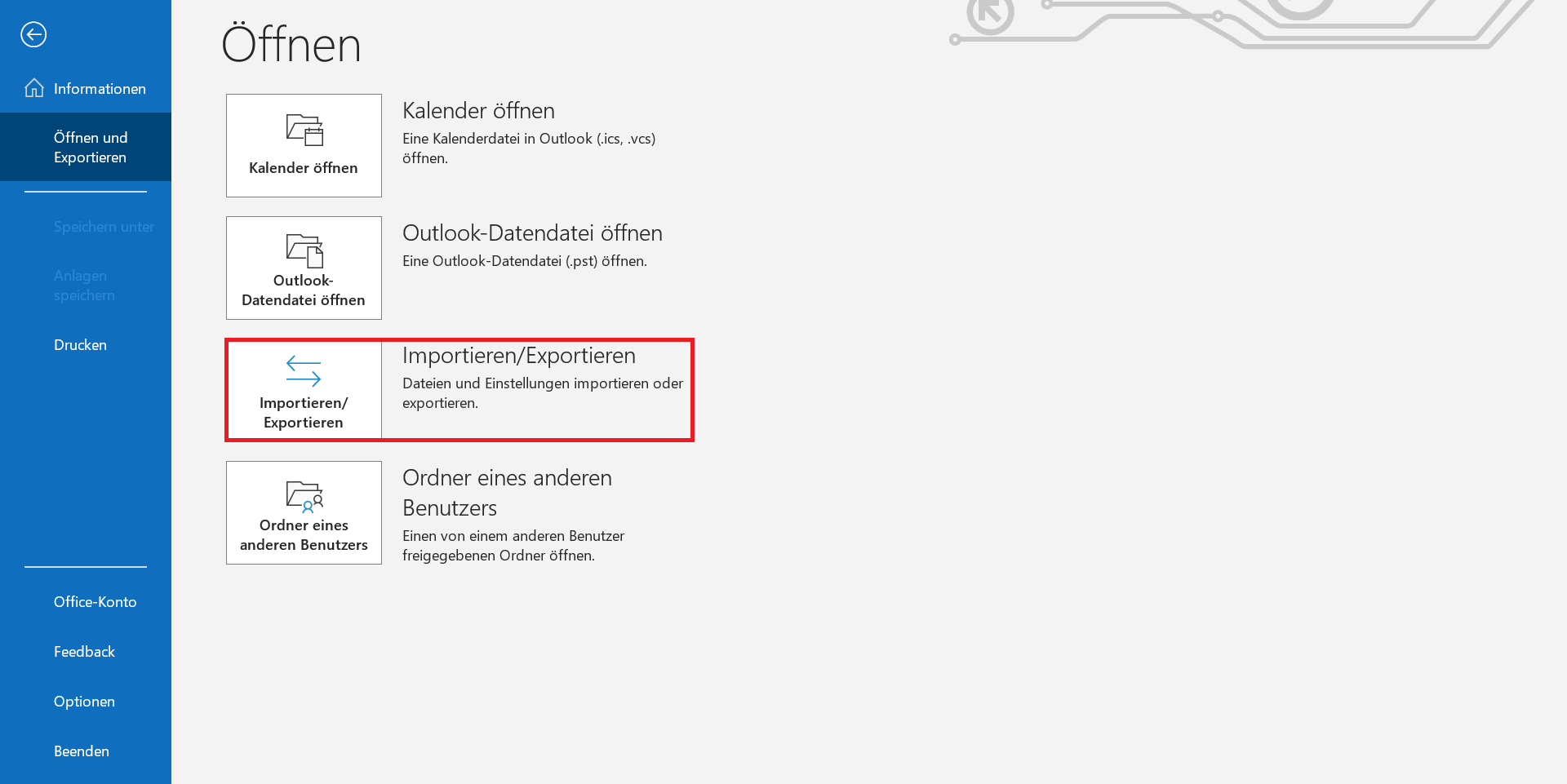Wähle links „Öffnen und exportieren“ und klicke auf die Schaltfläche „Importieren/Exportieren“.