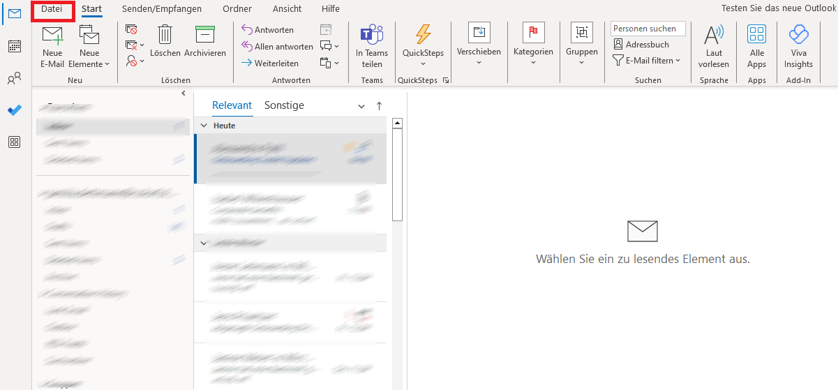 - In outlook auf „Datei“ klicken -> „Öffnen und Exportieren“ -> „Importieren/Exportieren“