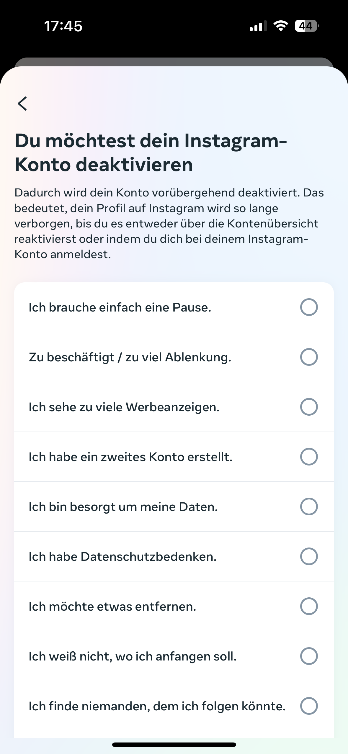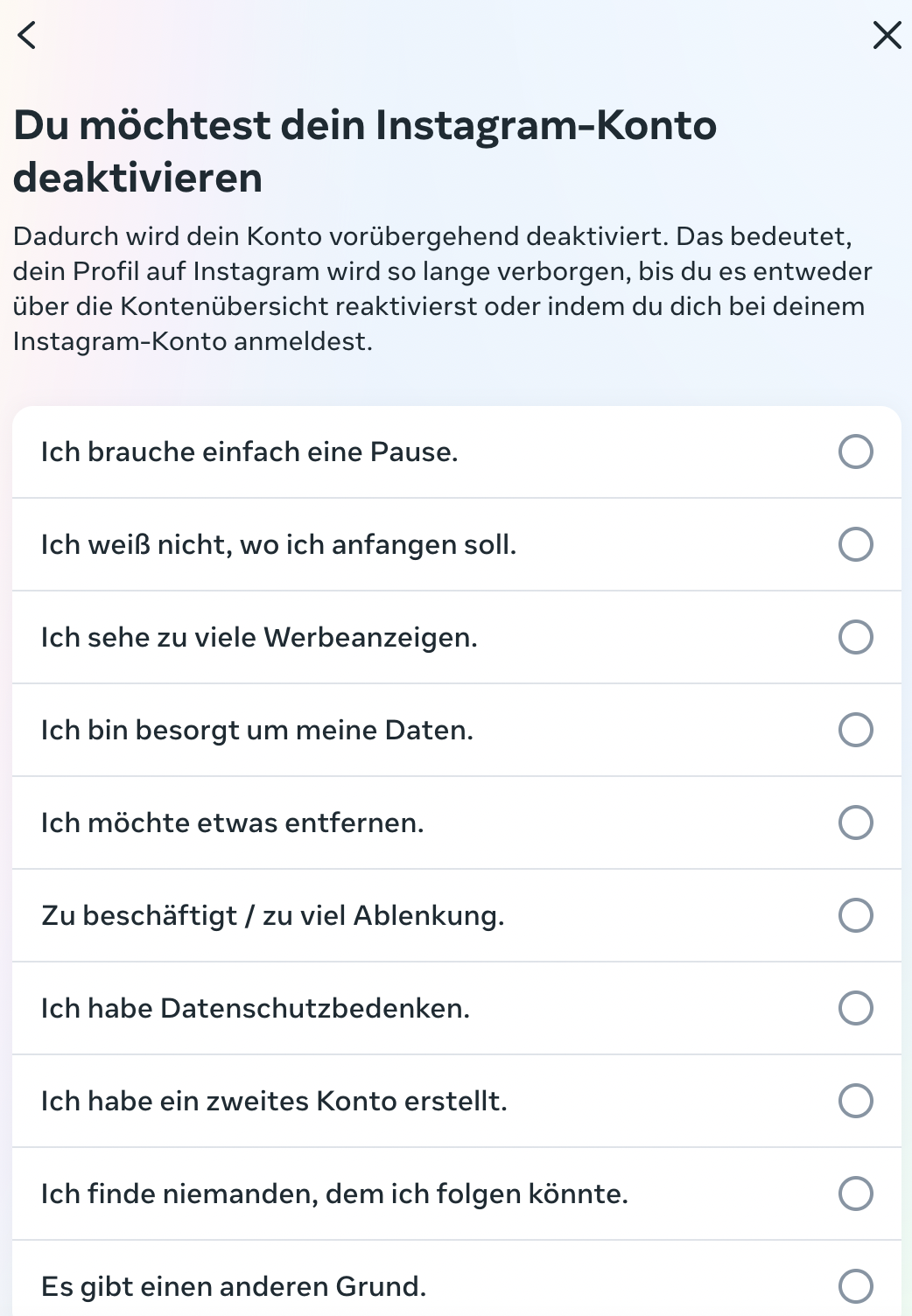 Wähle aus der Liste einen Grund für die De­ak­ti­vie­rung deines Kontos aus.