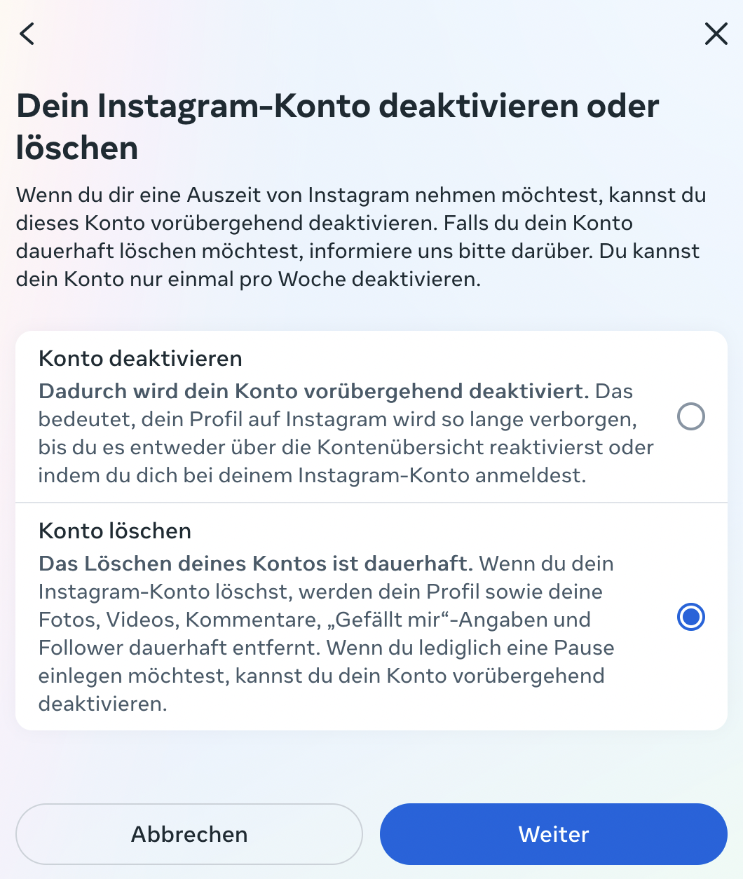 Wähle die Option „Konto de­ak­ti­vie­ren“ und folge den weiteren Schritten.