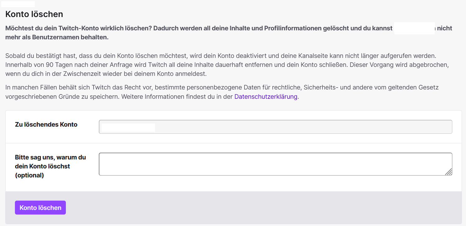 Um deine Daten voll­stän­dig zu entfernen, reicht der Weg über die normalen Kon­to­ein­stel­lun­gen nicht aus. Den passenden Link findest du statt­des­sen in den Da­ten­schutz­op­tio­nen von Twitch. Da die Löschung permanent ist, in­for­mie­re am besten vorab deine Community oder Freund:innen über dein Vorhaben.