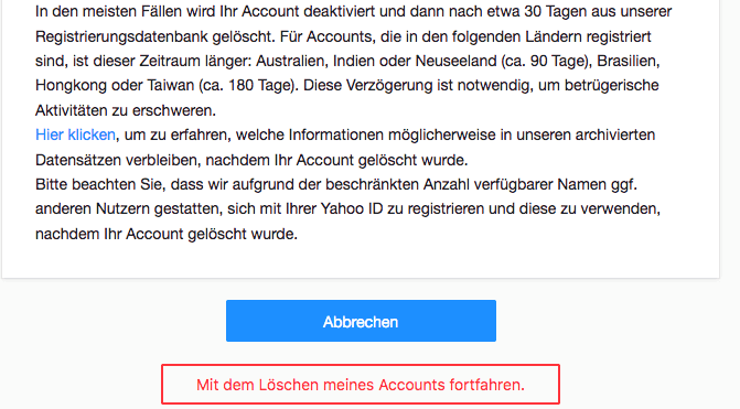 - Yahoo zeigt dir nun Infos zur Kündigung und den Folgen der Löschung an. Lies dir das kurz durch. Wenn du bereit bist, klicke auf „Mit dem Löschen meines Accounts fortfahren“.
