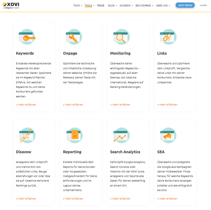 XOVI ist sowohl für Website-Betreiber:innen als auch für Profis attraktiv. Die Tarife unterscheiden sich primär durch die Anzahl der Projekte und Accounts. Seminare und Lernmaterialien runden das Paket ab.
