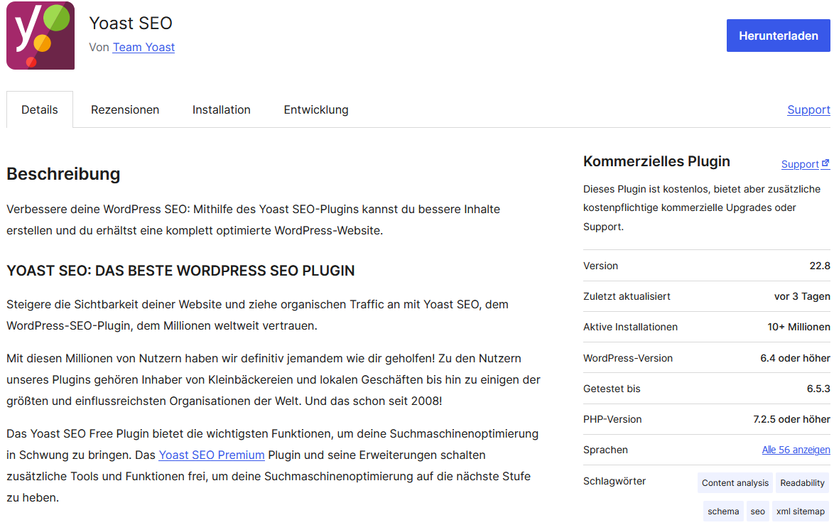 Einen ganz anderen Ansatz verfolgt Yoast. Als meistgenutztes SEO-Plugin für WordPress integriert es sich direkt in dein CMS-Dashboard. Der Vorteil liegt auf der Hand: Du optimierst, während du arbeitest. Die Key-Features: