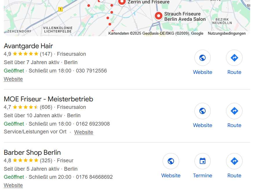 Bei­spiel­haf­tes Such­ergeb­nis einer lokalen Suche nach „Friseur Berlin“