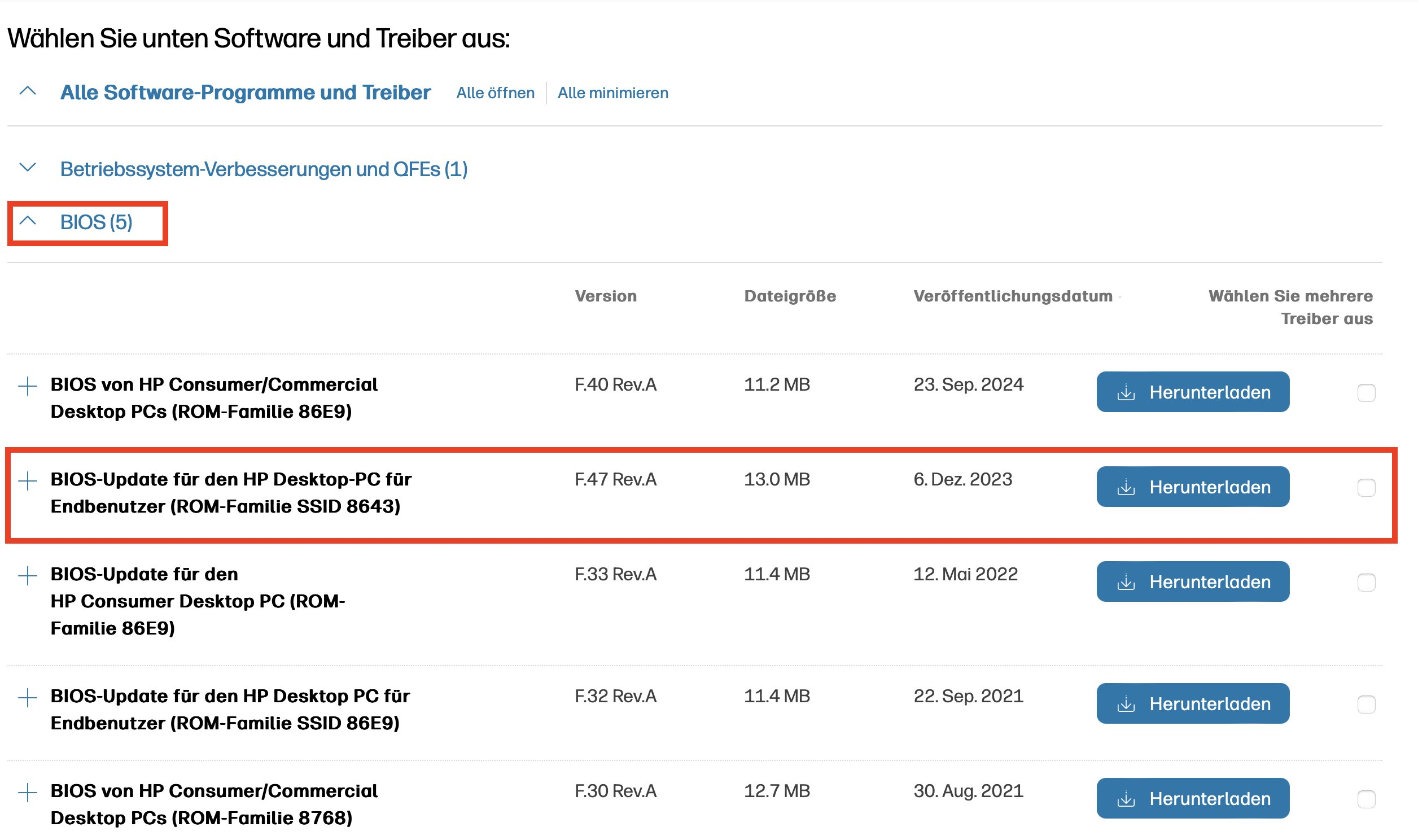 Sobald dein Produkt erkannt wurde, kannst du dein Betriebssystem spezifizieren. Unter den Rubriken „BIOS“ oder „Firmware“ werden dir die verfügbaren Updates angezeigt. Gleiche die Versionsnummer mit deinen Notizen ab. Ist die online gelistete Version neuer, starte den Vorgang mit einem Klick auf „Herunterladen“.