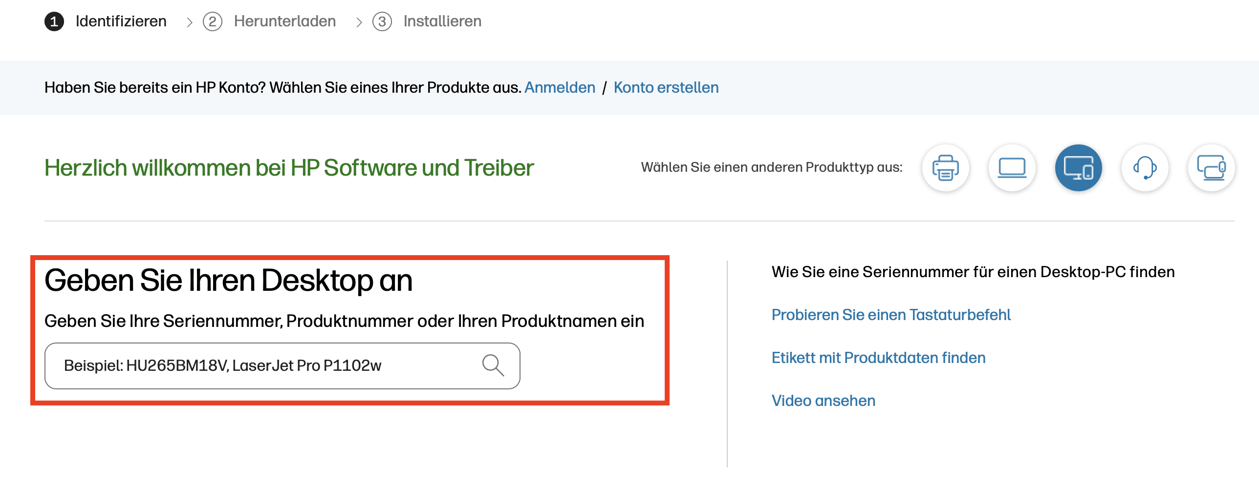 Wähle nun deinen Produkttyp aus und gib die Modellbezeichnung oder Produktnummer deines HP-Geräts ein. So erhältst du Zugriff auf die passenden Treiber und BIOS-Dateien für dein System.