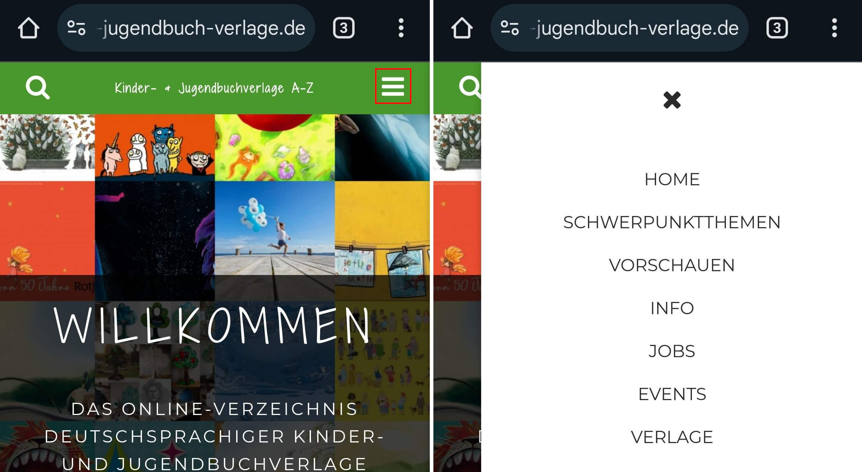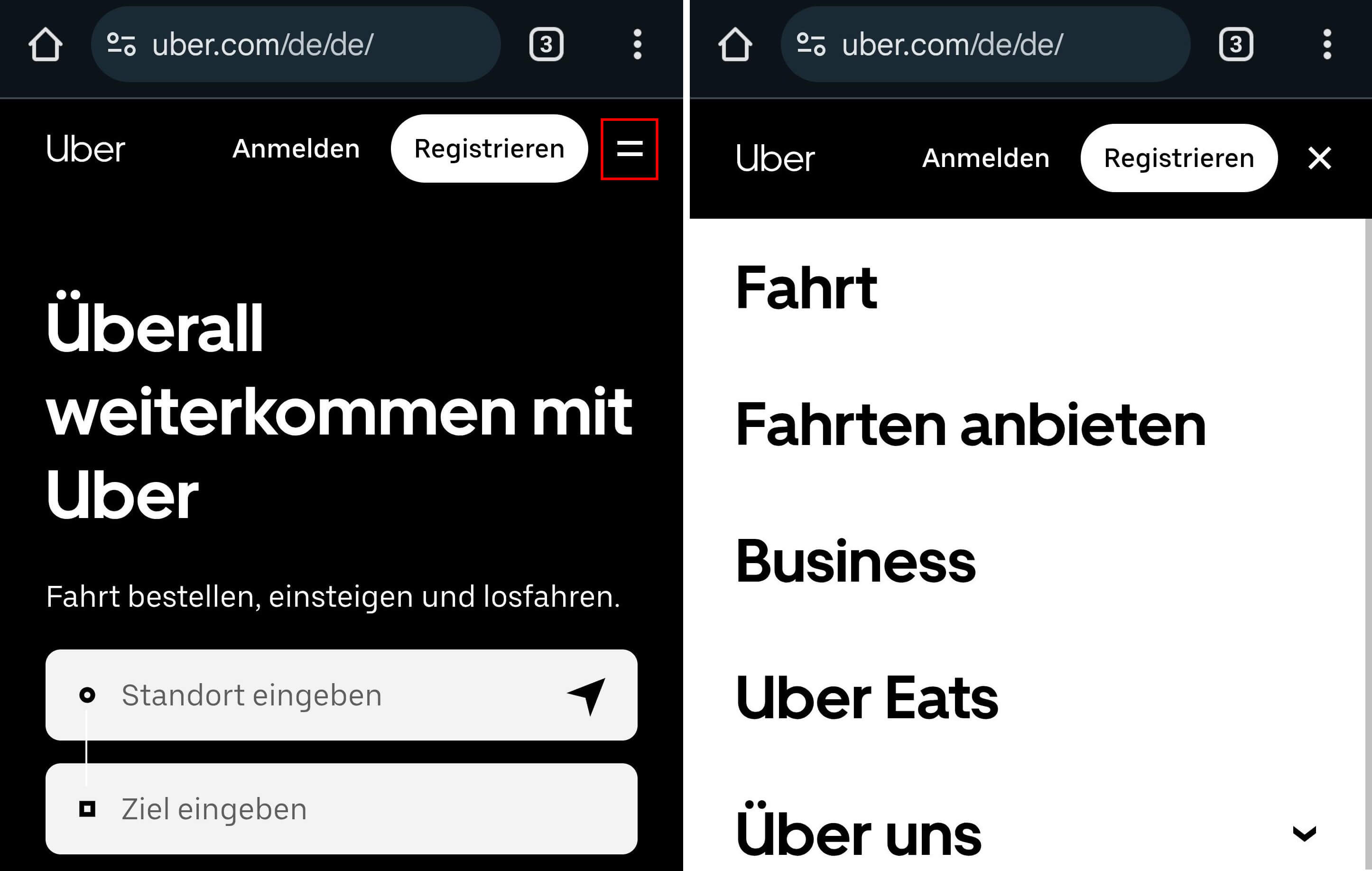 Hier „parkt“ das Menü außerhalb des sichtbaren Bereichs. Erst beim Klick auf das Icon fährt die Navigation von der Seite ins Bild und nimmt meist den gesamten Platz ein. Das ist besonders bei großen Navigationsstrukturen mit vielen Ebenen eine saubere und aufgeräumte Lösung.