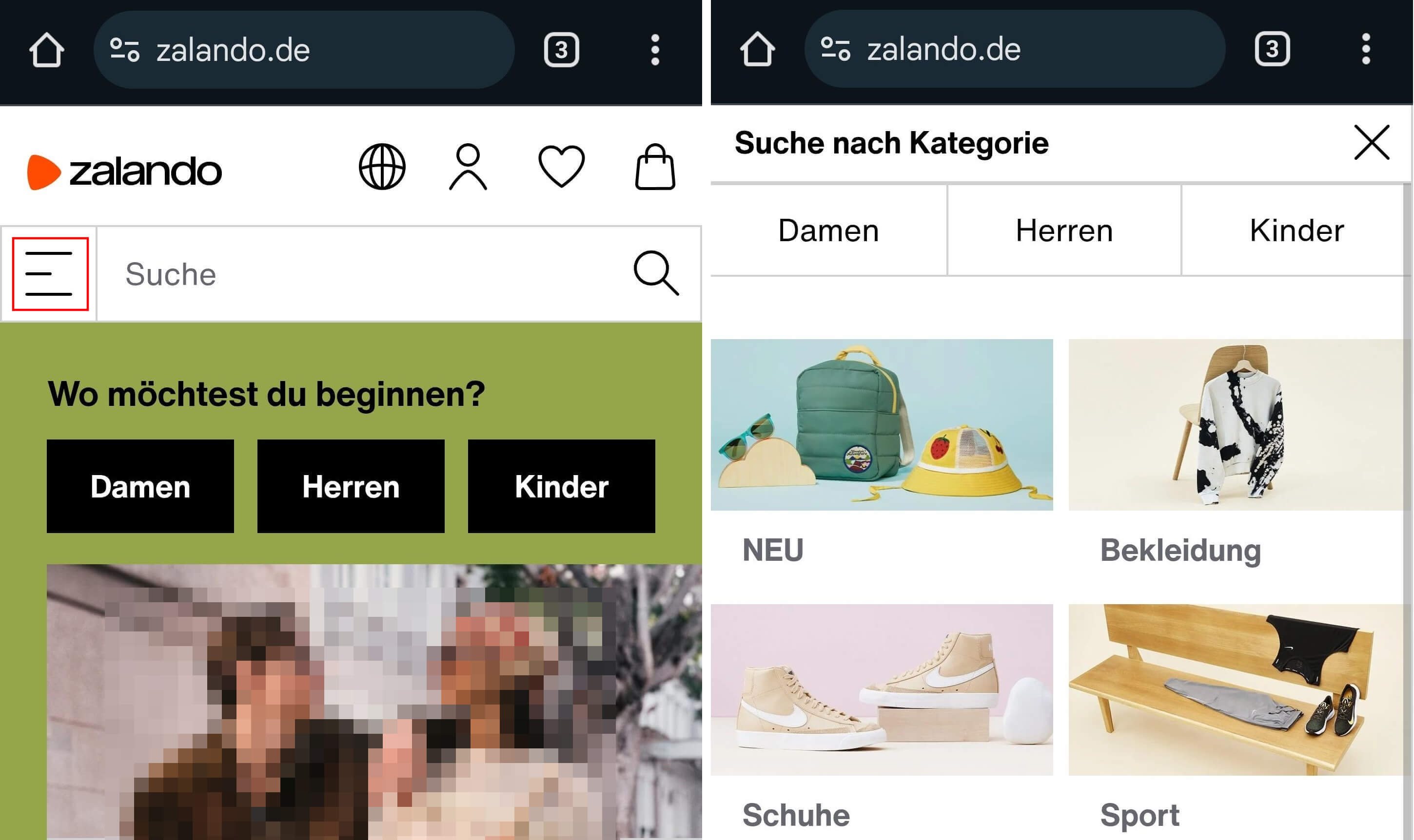 Navigationen im Footer sind jedoch weniger komfortabel: Deine Besucher:innen erwarten wichtige Elemente sofort griffbereit, weshalb diese Lösung seltener wird. Heute findet man die mobile Navigation meist direkt am oberen Bildschirmrand. Diese klassische Platzierung ist gelernt und für die meisten Nutzer:innen intuitiv.