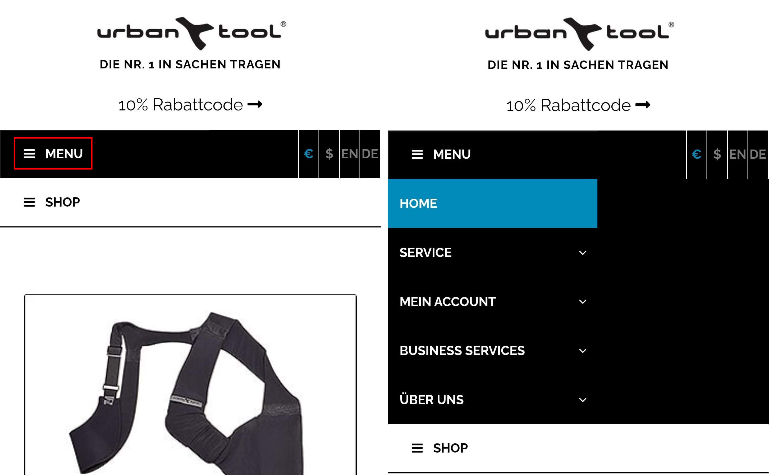 Das Dropdown-Menü ist der Klassiker. Es ähnelt der Desktop-Steuerung und ist Nutzer:innen daher bestens vertraut. Per Klick auf das Icon klappt das Menü nach unten auf und legt sich über den Inhalt, ohne die komplette Seite zu verdecken.